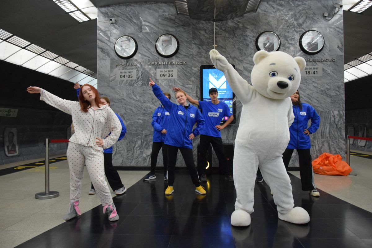 Молодая гвардия «Единой России» вместе с белым мишкой провела зарядку на станции метро «Чкаловская» для жителей Екатеринбурга. Мероприятие прошло в преддверии Дня физкультурника, который традиционно отмечается 10 августа. В течение получаса активисты под музыку показали энергичные движения для утренней зарядки.