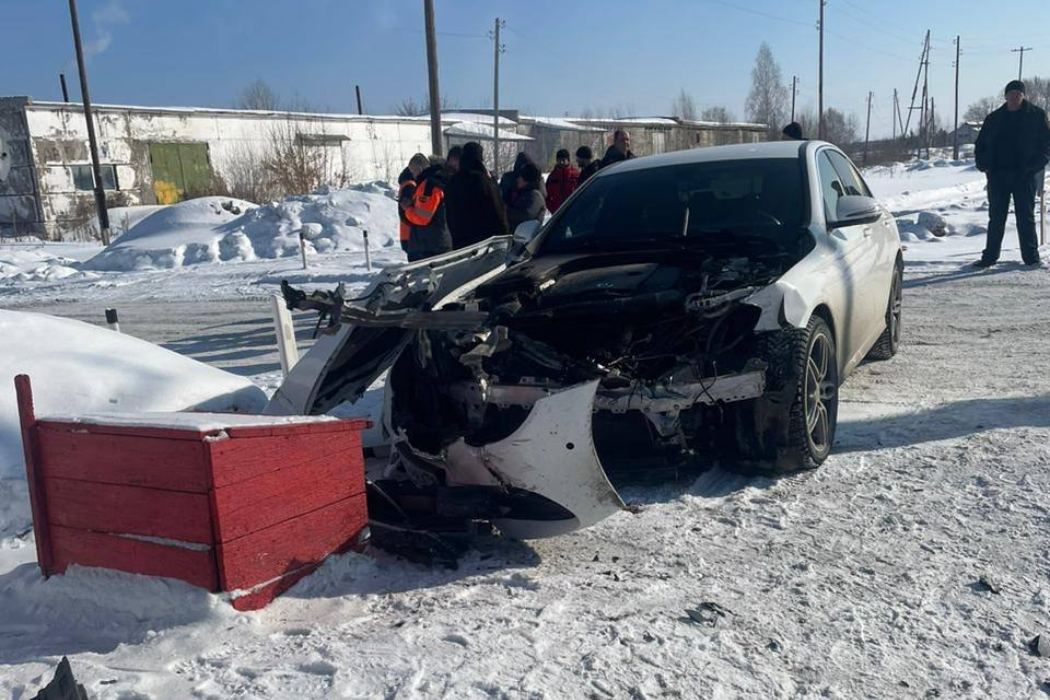 В Свердловской области пригородный поезд на переезде столкнулся с легковым автомобилем Mercedes.