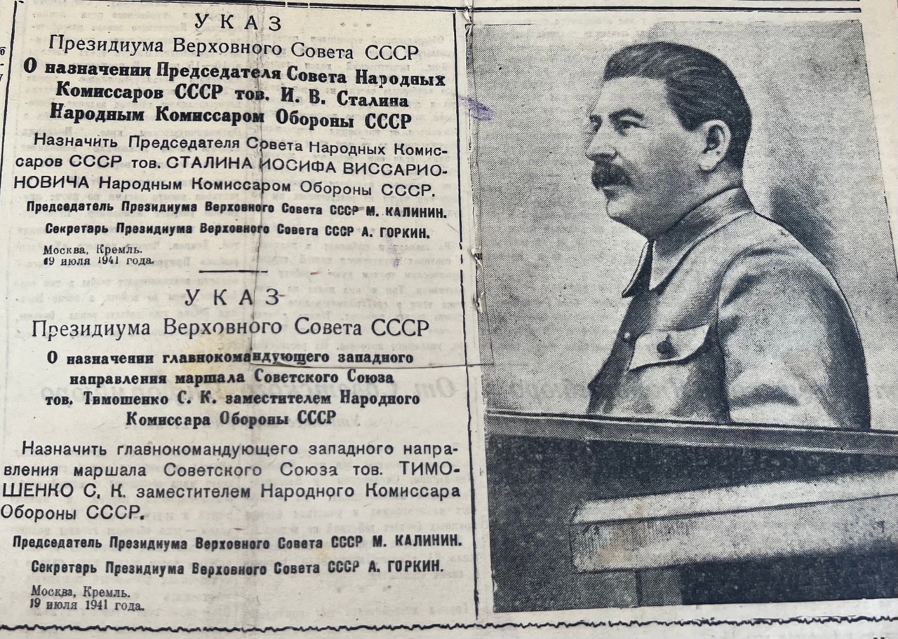 На первой полосе «Тагильского рабочего» от 22 июля 1941 года большой портрет Иосифа Сталина. Главным событием последних дней стало его назначение народным комиссаром обороны СССР. Также на передовой странице сообщают о соглашении между правительствами СССР и Чехословацкой республики. Ниже можно прочитать занимательную телеграмму товарищу Сталину от федерации шахтеров Австралии. Они шлют поздравления народу и Красной Армии «в их замечательной борьбе вторгнувшихся армий германского фашизма».