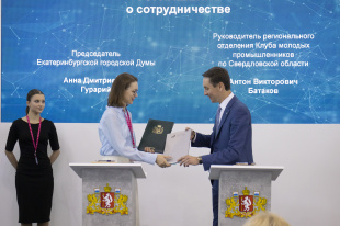 Председатель Екатеринбургской городской Думы Анна Гурарий и руководитель свердловского отделения Клуба молодых промышленников Антон Батаков заключили соглашение о сотрудничестве. Документ они подписали в рамках мероприятий «Иннопрома».