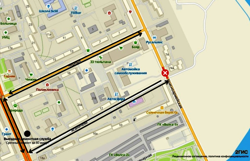 Карта перекрытий и объезда участка улицы Красноармейская / 2ГИС