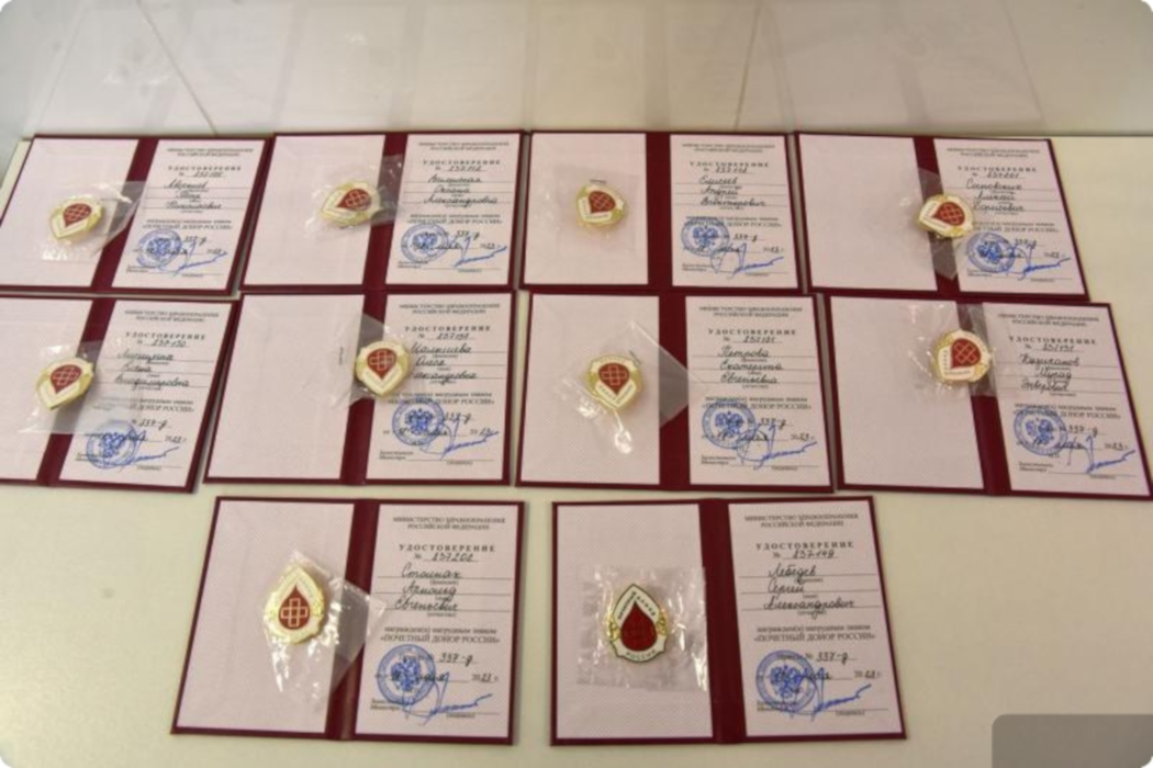 Нагрудные знаки и удостоверения «Почётный донор России» в Екатеринбурге получили 10 человек, всего в подразделениях Областной станции переливания крови наградили около 100 доноров. Знак получают добровольцы, которые сдали кровь 40 раз, с начала этого года его получили 497 свердловчан, рассказали ИА «Уральский меридиан» в департаменте информполитики Свердловской области.